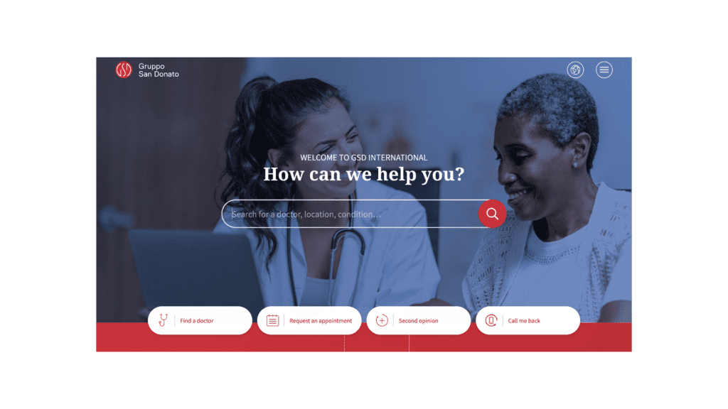 Già a partire dalla homepage, l’utente viene accolto da una domanda relativa alle sue necessità, e accompagnato in un processo di scambio di informazioni che lo porta alla richiesta della prestazione desiderata e alla conversazione con un patient care manager del GSD.