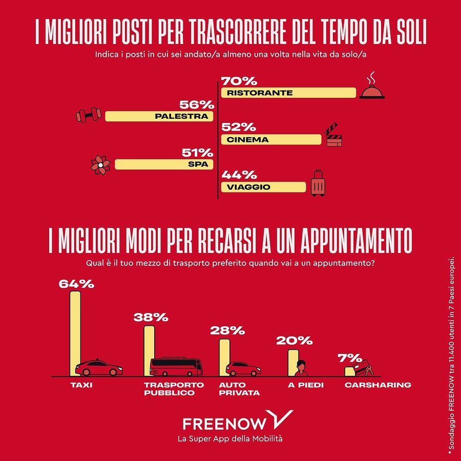 Quasi la metà dei single intervistati (41%) dichiara di aver viaggiato almeno una volta nella vita da solo nel proprio Paese o all’estero. Curiosamente, il solo travel è un’esperienza comune sia tra chi è in una relazione (45%) e chi è sposato (14%), e allo stesso modo single e innamorati sono ugualmente più propensi ad andare da soli a teatro o a vedere stand-up comedy (a pari merito con il 42%). Non solo, lo studio FREENOW ha dimostrato che le persone che hanno una relazione sono “decisamente più disposte” anche ad andare da sole in un locale o in un bar dove non conoscono nessuno rispetto ai single (43% contro 36%).